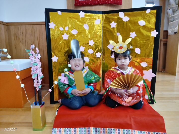 赤いお着物のおひなさま、みどりのお着物のおだいりさまになりきって、金屏風の前で撮影会をしましたよ☆