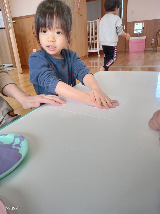 どの子も力強く「パー」をして、紙にギュっと押し付けて綺麗な手形を取ることが出来ました!