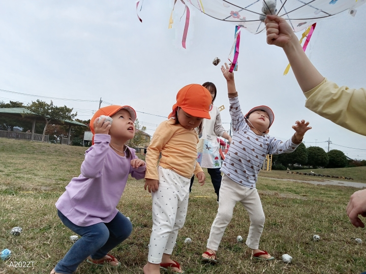 ひっくり返した傘目掛けて、音楽に合わせて行う「玉入れ」、