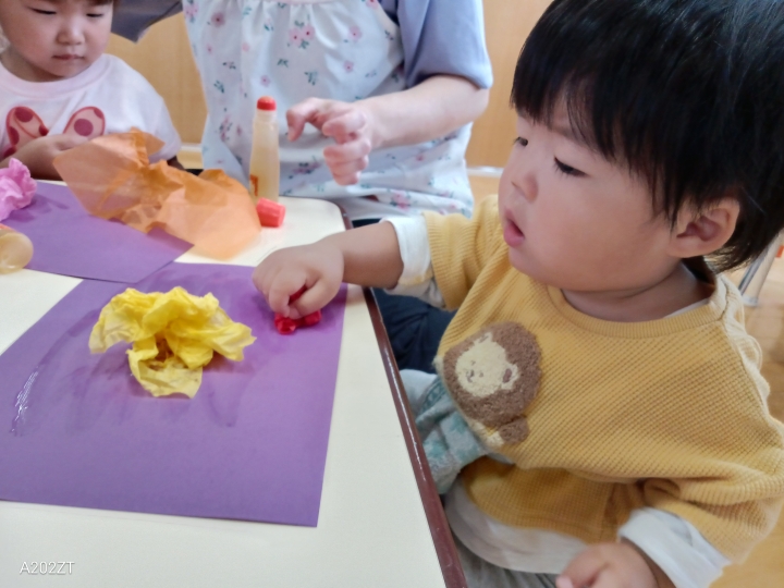 にじ組さん、折り紙をビリビリと破き、のりをぬりぬりぺったん!