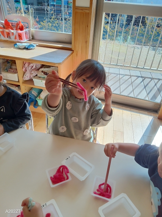 上手に持てたら、実際に毛糸のうどんを掴んでみます♪